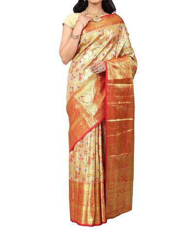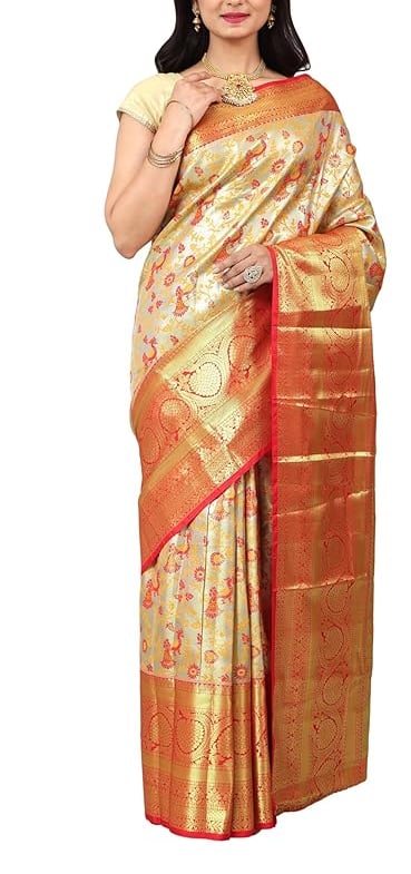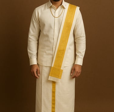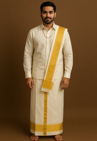 The groom traditionally wears a veshti (dhoti) and angavastram in silk, often white or cream with a zari border, reflecting simplicity and elegance. For the rituals, he may also wear a silk kurta or sherwani. His jewellery is minimal compared to the bride, usually a gold chain, rings, and sometimes a simple forehead ornament, highlighting his role with dignity and grace.