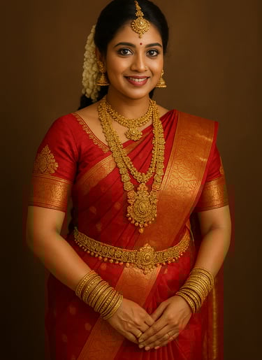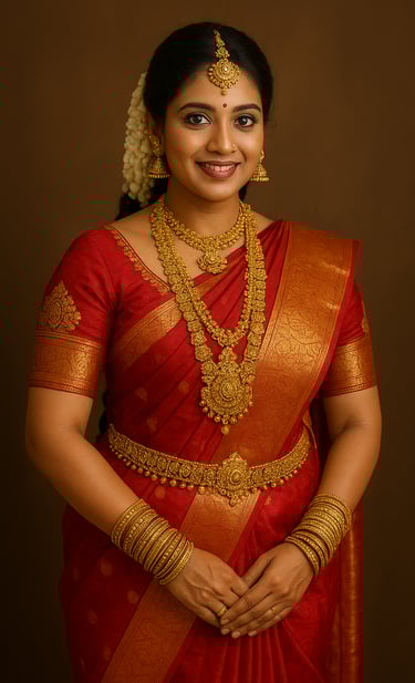 The Tamil bride usually looks radiant in a richly woven Kanchipuram silk saree, often in bright hues like red, maroon, or gold, symbolizing prosperity and happiness. She is adorned with layers of gold jewellery, from traditional oddiyanam (waist belt), vanki (armlets), and jhumkas (earrings) to long temple-style necklaces and the sacred thaali. Flowers, especially fresh jasmine, beautifully decorate her braid, completing her regal look.